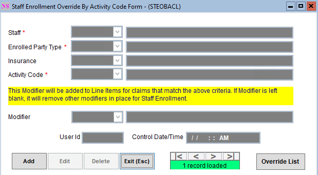 Add insurance to the Staff Enrollment Override By Activity Code Form | Maintenance and Setup > Employees > Staff > Staff > Enrollment List > Override By Act Code List