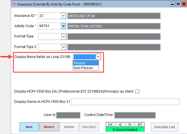 Add rendering provider override options to the Insurance Override By Activity Code | Maintenance and Setup > Insurance > Insurance Override By Activity Code This form now includes a setup option to choose which name, NPI, and optionally, taxonomy to populate in the Rendering Provider (2310B loop) per Insurance and Activity Code. It also provides an option to select a “Person” or “Non-Person”.