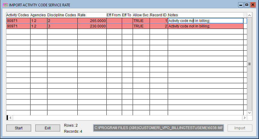 Note: Rows are the number of individual rows on this import screen, while Records is the count of each record being inserted into the Service Rate setup.