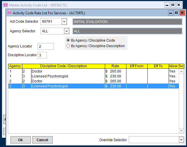 In the example pictured above, I want to increase the rates for the Activity Code 90791 for both Agency 1 and 2, as well as for the Doctor and the Licensed Psychologist. In this case, the two disciplines have different rates.